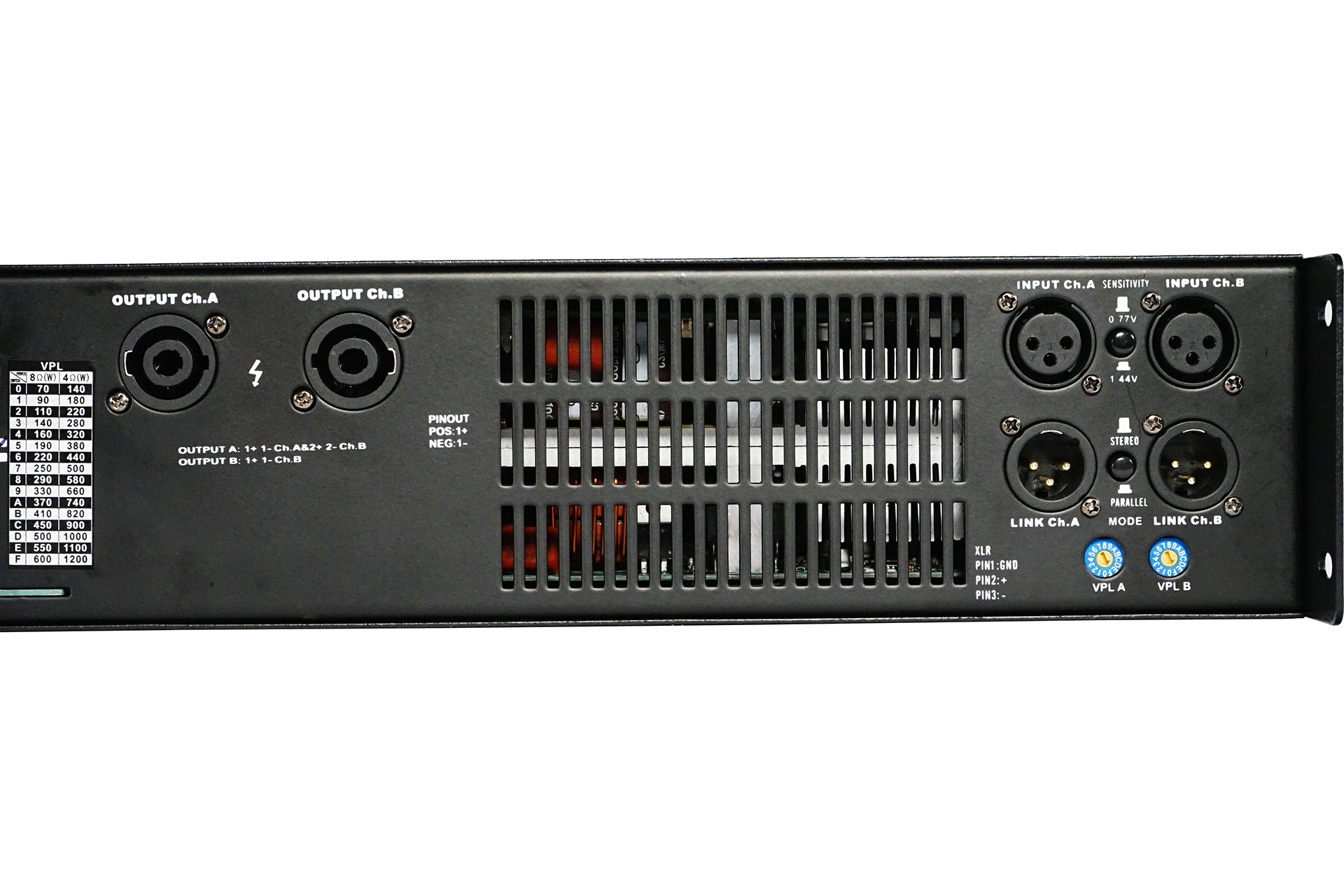 D class high performance 2 channels amplifier, 2 x600 w/8ohms , 2 x 1200w/4 ohms, XLR input, speakon output, led VU meter, temperature control fans, frequency responce 20Hz - 34Kz,adjustable VPL, 10kg.