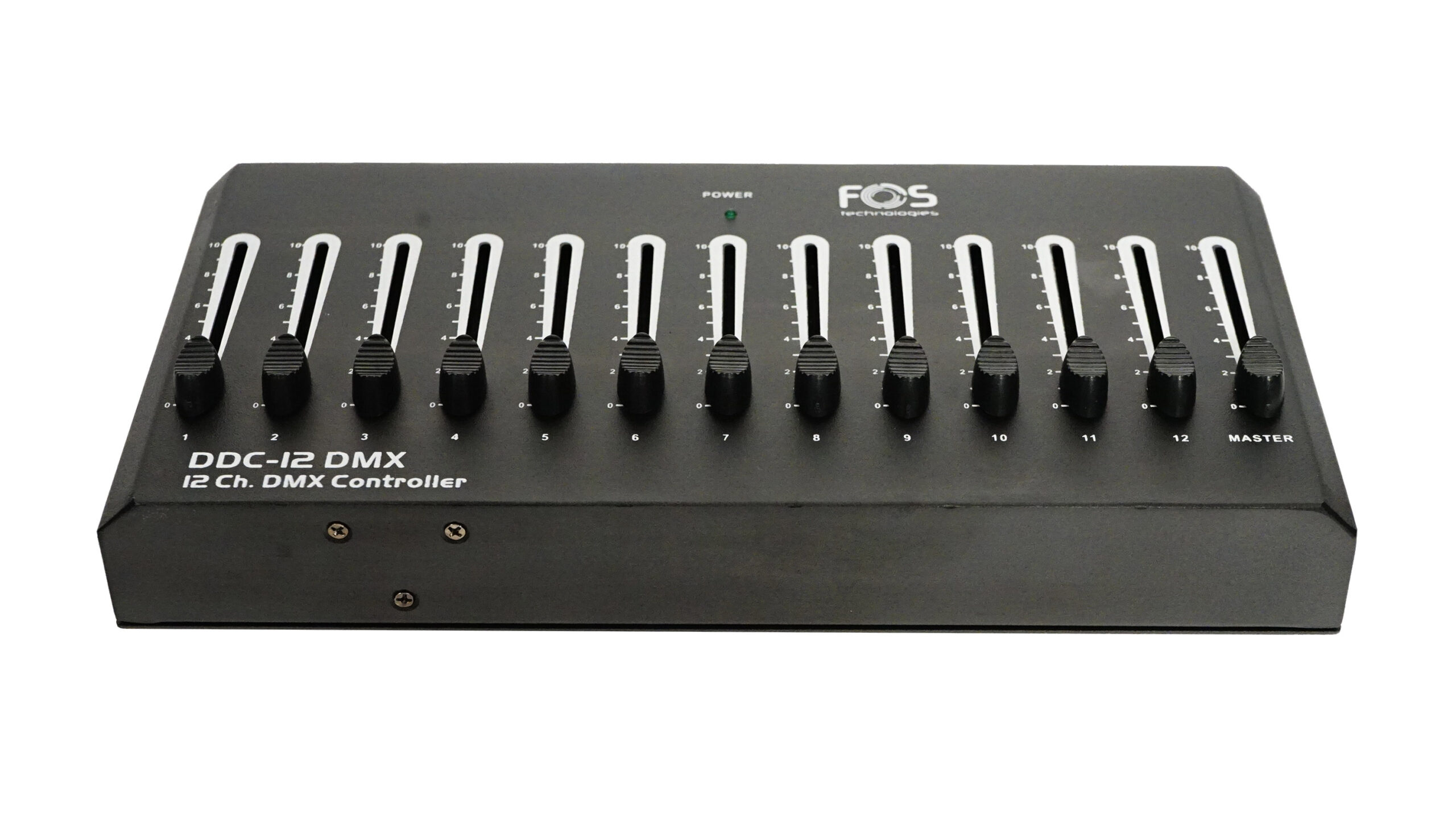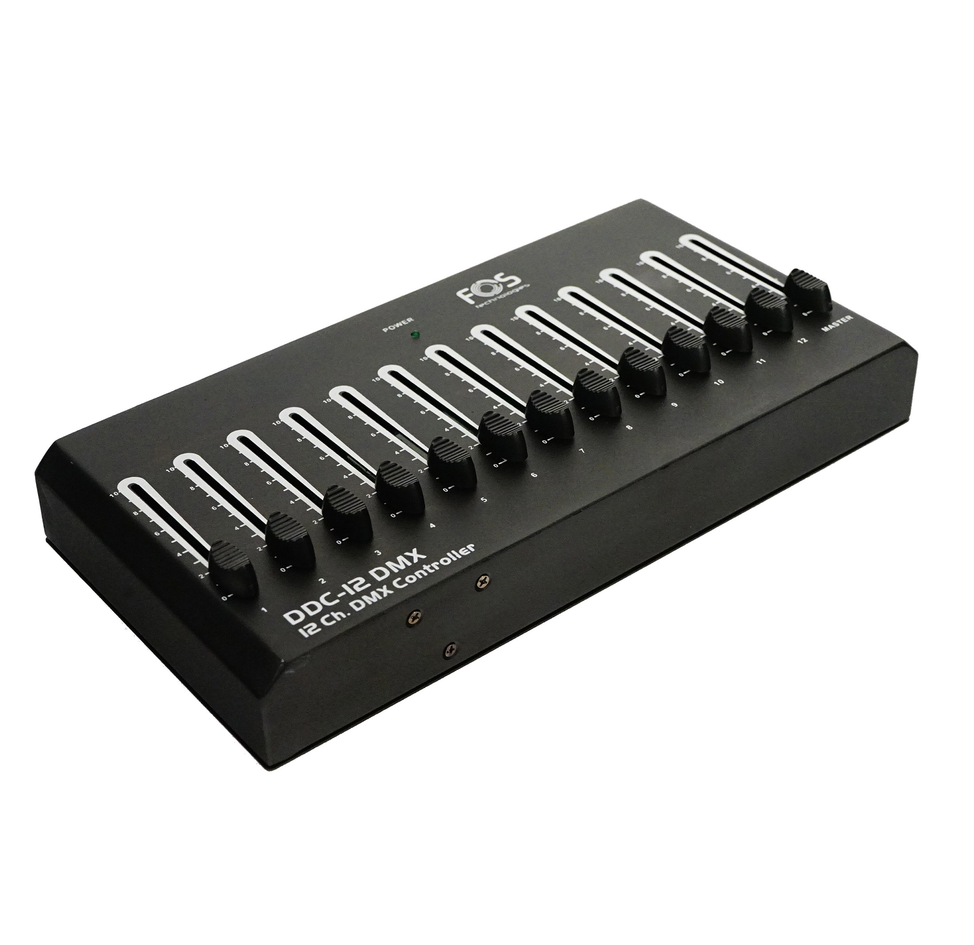 12 Channels Dmx Controller, 12 individual channel faders one master fader. 12 DMX channels. Compact design simple operation, DMX Output: 3 pin female XLR DMX connector.