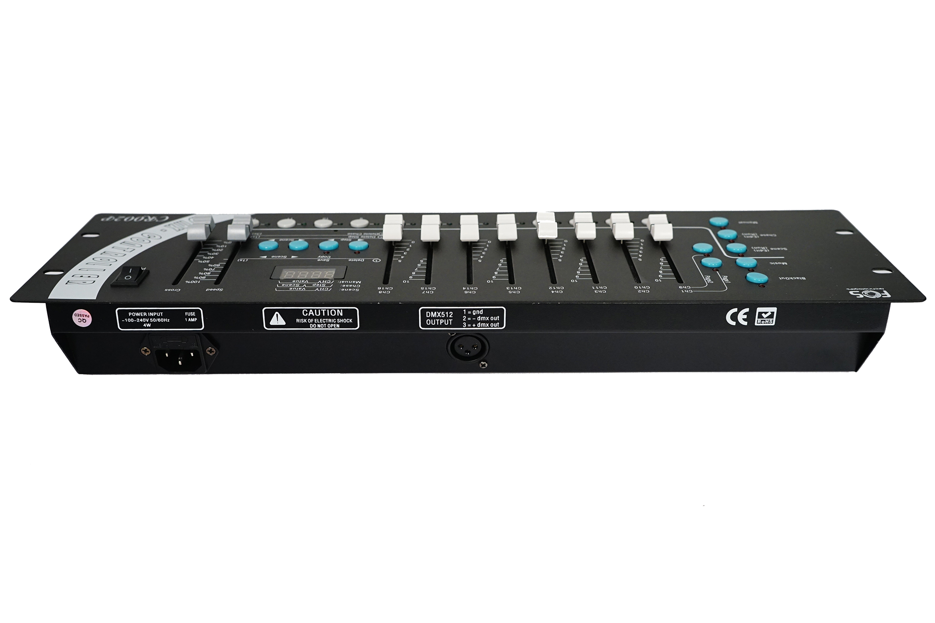 192ch DMX console, 12 scanner buttons for quick individual control, 30 banks with memory space up to 8 scenes each, 6 chases can program 240 scenes respectively