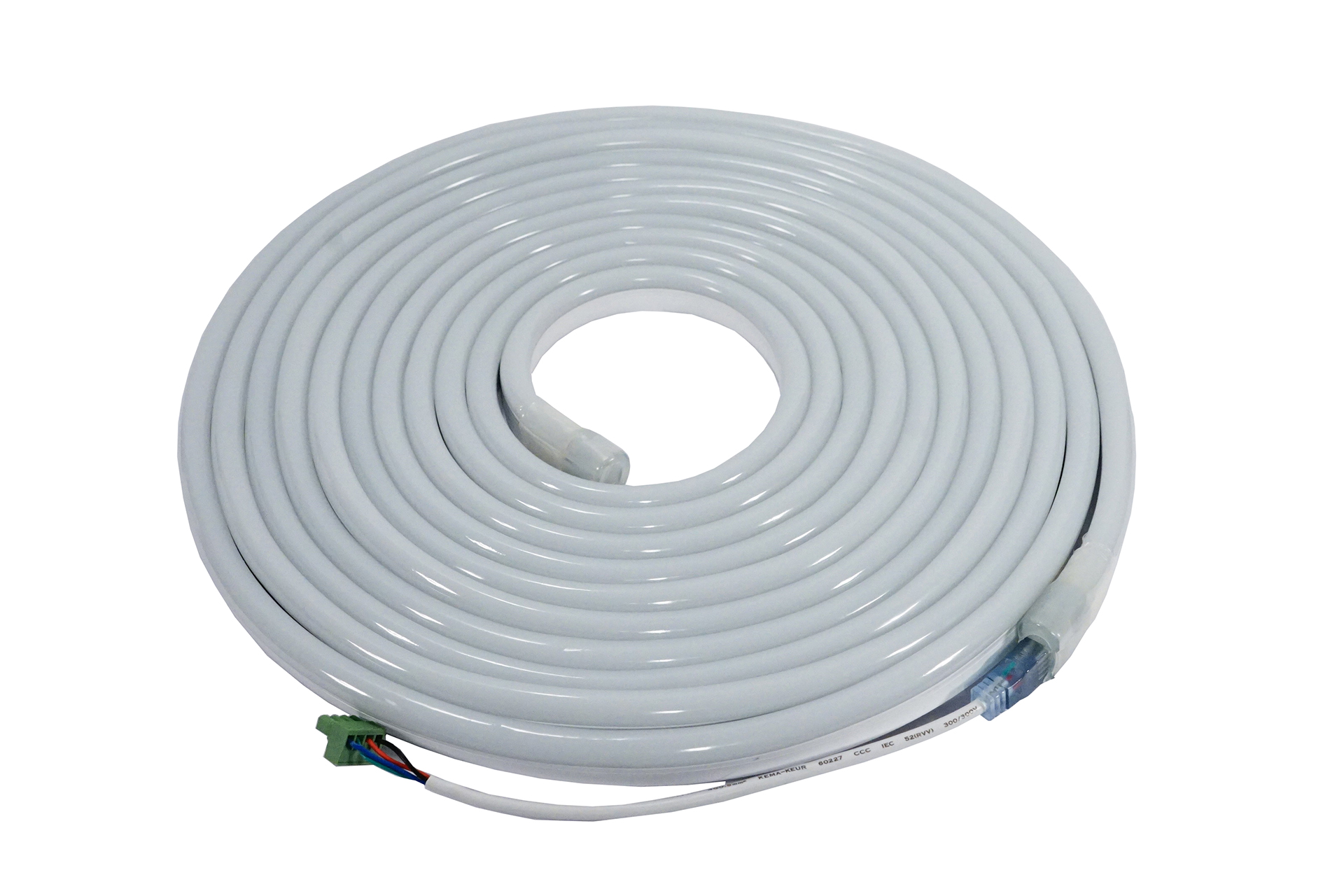 Weatherproof IP67 Neon Flex 10 meter SMD5050 Led RGB tape set, Power input: DC 24V, Power/meter: 17.2W, Cutting length: 0.5m, Max. length/power input: 15m, size 20mm x 10mm, included powercord , 10 mounting clips, 5 end caps, 5 middle connectors, 5 shrink tubes.