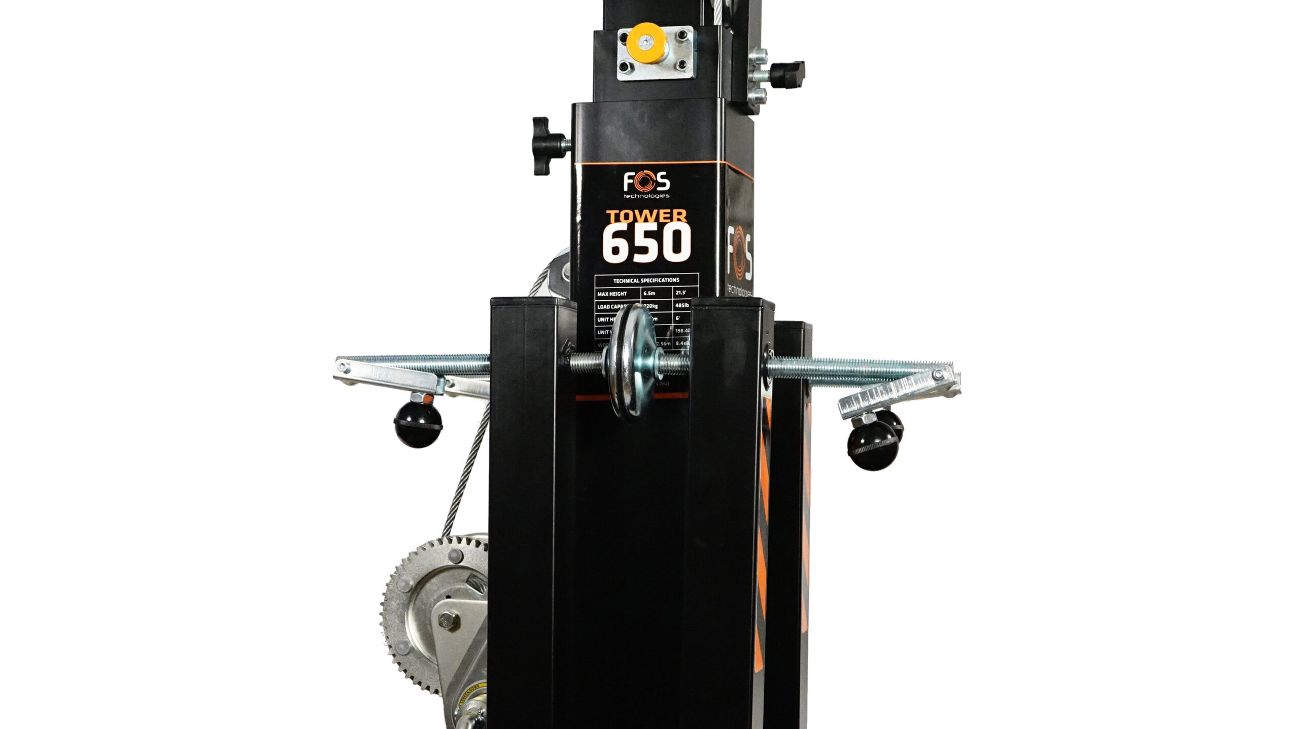 Telescopic lifting tower with 220 kg loading capacity , maximum height 6.5m , unit weight 90kg folded weight 1.82m , automated lock system , transportation wheels , BGV-C1 certified.