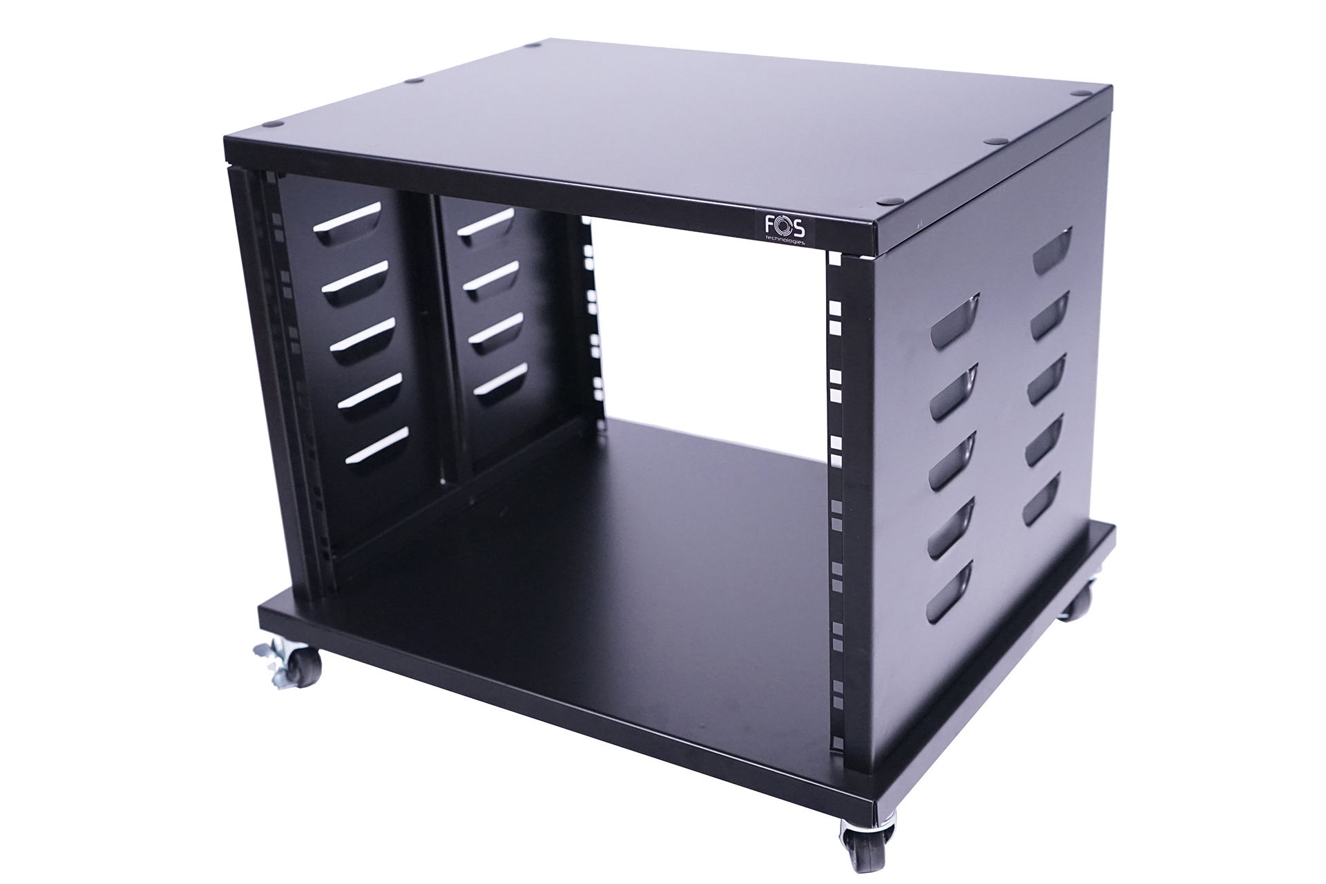 Professional 8U installation Rack, 19" format, robust steel design, Installation depth: 40 cm, base size 56x46cm, top size 53,5x40,5cm, Includes heavy duty brackets on both sides of the middle guide rails of the inner walls,4 Stable casters, installation height 39.7cm