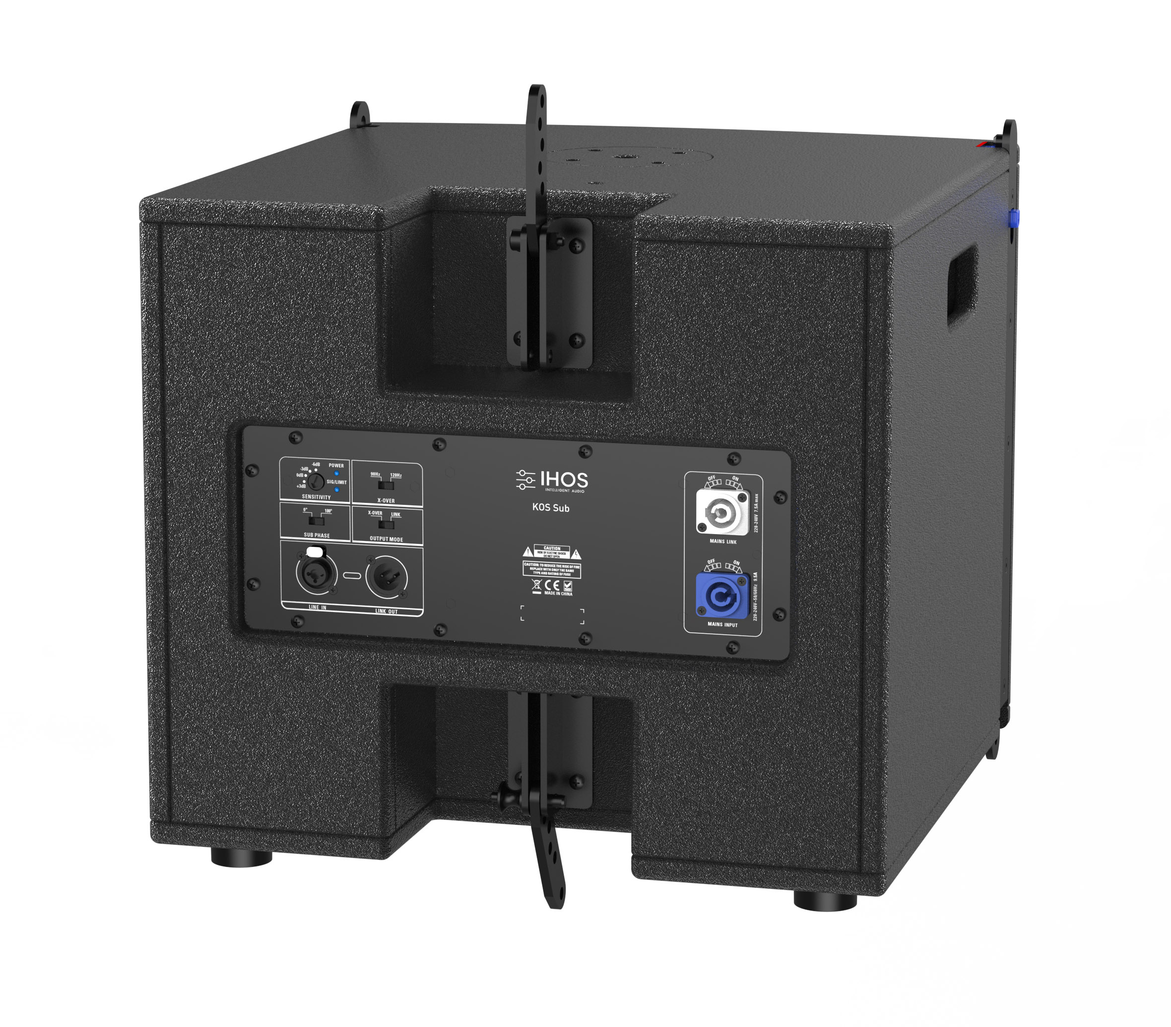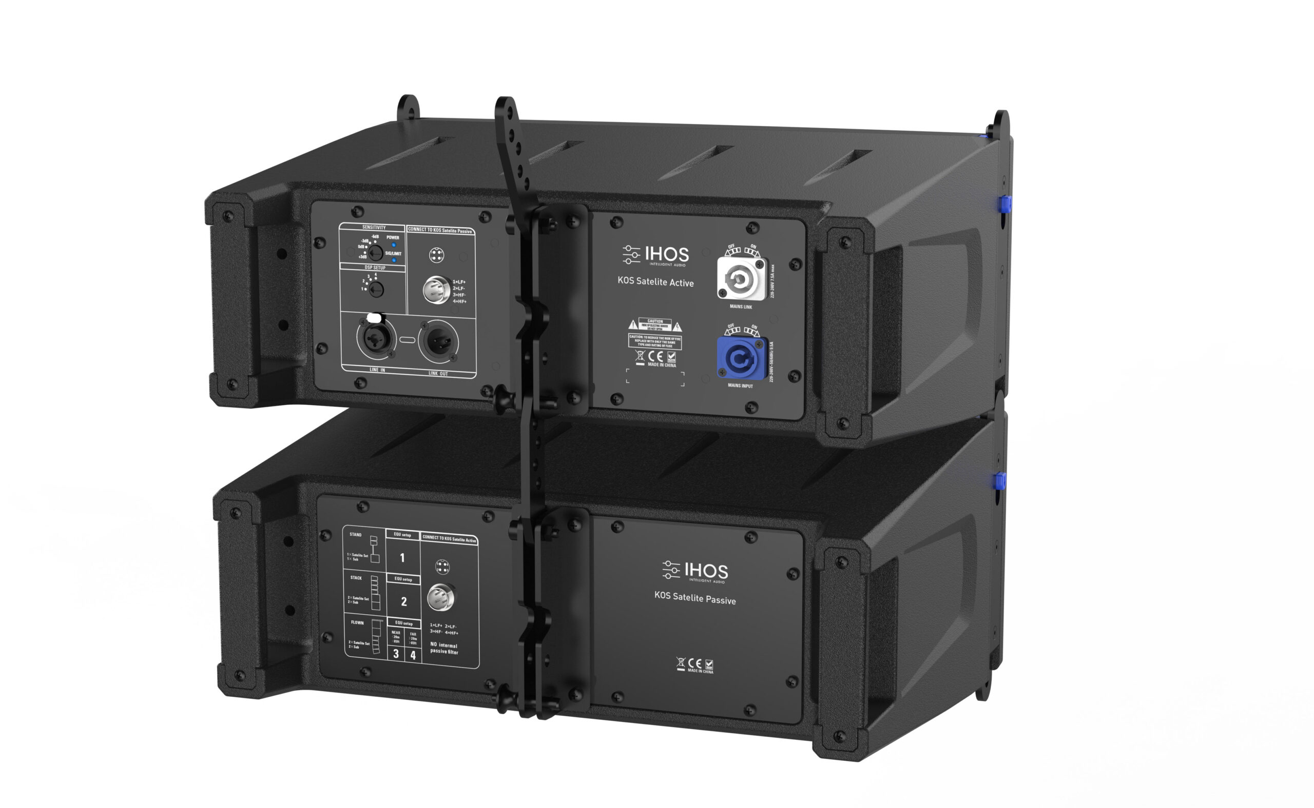 KOS System 4 Line Array system that includes 8 pcs KOS ABS Active Line Array speakers, 4 pcs KOS Sub Plywood professional active bandpass subwoofer 12 inches, 1 pc KOS Flybar, 1pc extension hanger. Hanging mode suitable for 400-450 audience people.